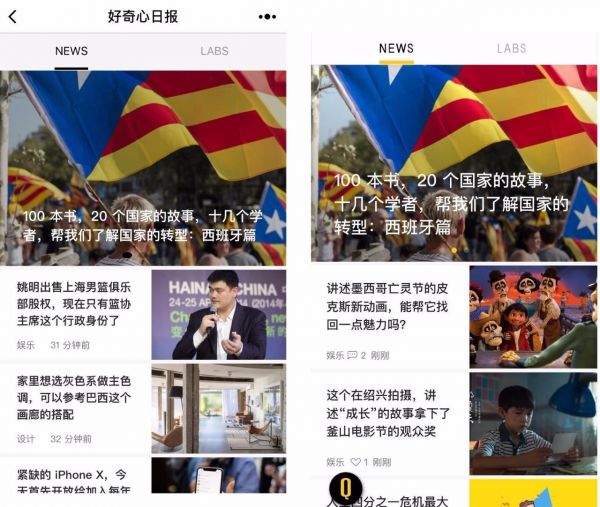 “好奇心雜志”基本就是好奇心日報App的精簡版,省略了App中的評論功能,除此之外都很相似。圖左為小程序,圖右為App